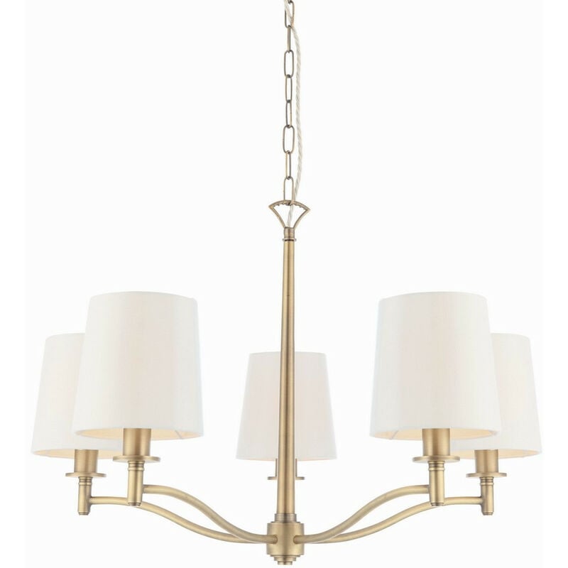 Endon Ortona - Ciondolo multibraccio a 5 luci in ottone antico opaco, finta seta bianca vintage, E14 | Finitura: finta seta bianca vintage, lastra in ottone anticato opaco | Materiale: tessuto, acciaio | Classificazione IP: IP20 | Altezza min (cm): 50 | Altezza massima (cm): 200 | Diametro (cm): 74 | Diametro paralume (cm): 12,5-15 | Numero di luci: 5 | Tipo di lampada: E14 | Lumen: 400