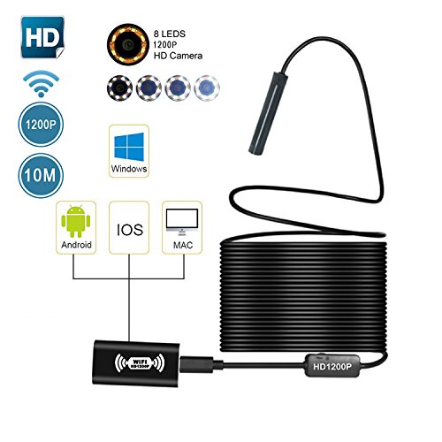 Endoscopio Wifi, Umiwe Senza Fili Endoscope Borescope Telecamera di Ispezione Impermeabile Semi-rigida 1200HD Wifi con Telecamera a Serraggio CMOS a 8 Megapixel con 8 LED Registrabili per Sistemi Andr (Nero-10m)
