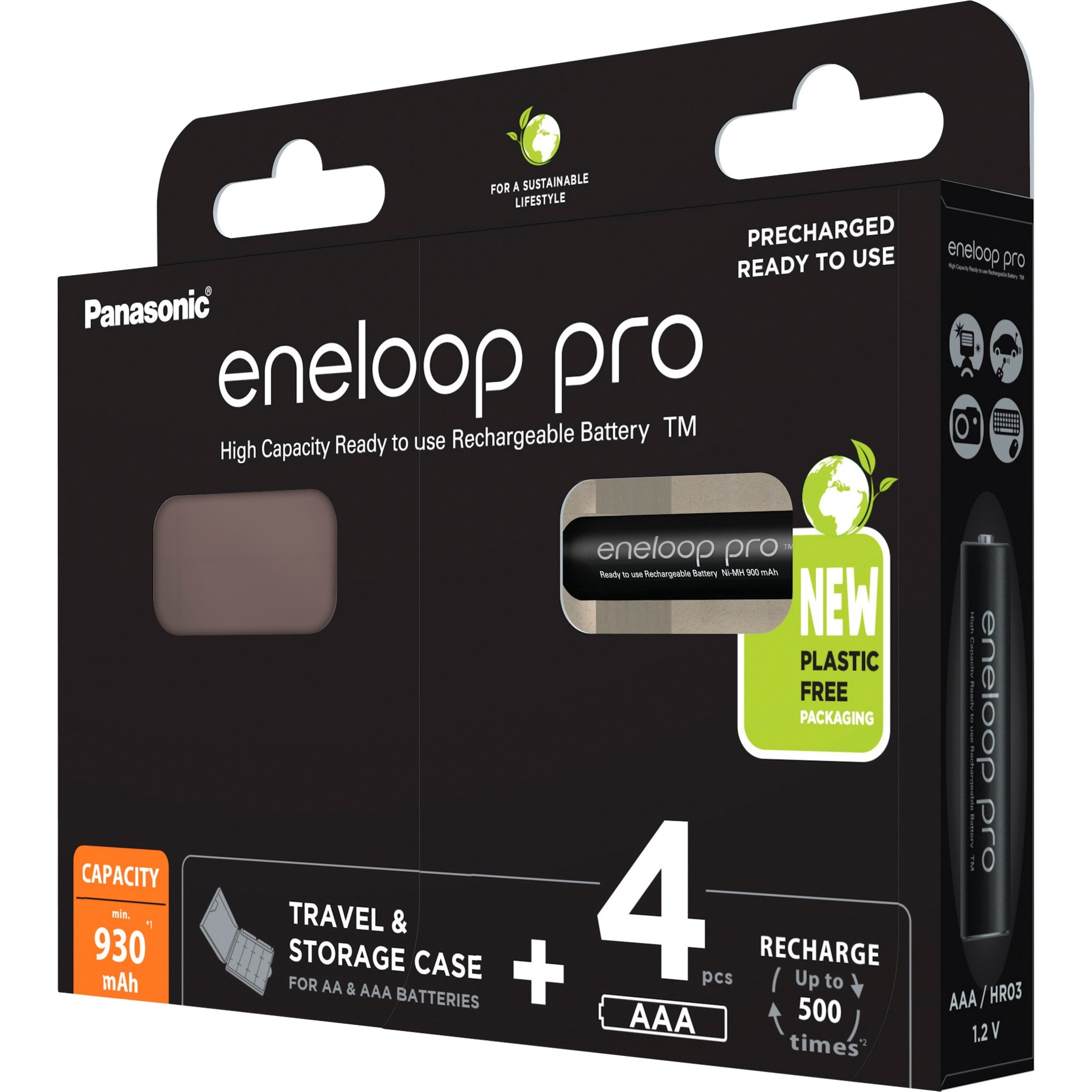 Le batterie eneloop pro Panasonic sono ideali per dispositivi con requisiti di alimentazione elevati, come walkman, unità flash, controller di gioco, giocattoli telecomandati e una vasta gamma di elettrodomestici. La massima qualità di produzione con una produzione di alta precisione e materiali all''avanguardia garantiscono un funzionamento ottimale della batteria, prestazioni elevate e prestazioni di scarica stabili con un''autoscarica molto bassa allo stesso tempo. Hanno una durata particolarmente lunga, un amperaggio molto elevato, sono resistenti al calore e possono essere conservati a lungo. Una confezione di eneloop pro BK-4HCDEC4BE contiene quattro batterie AAA (Micro), ciascuna con 930 mAh, oltre a una scatola da viaggio e di stoccaggio.