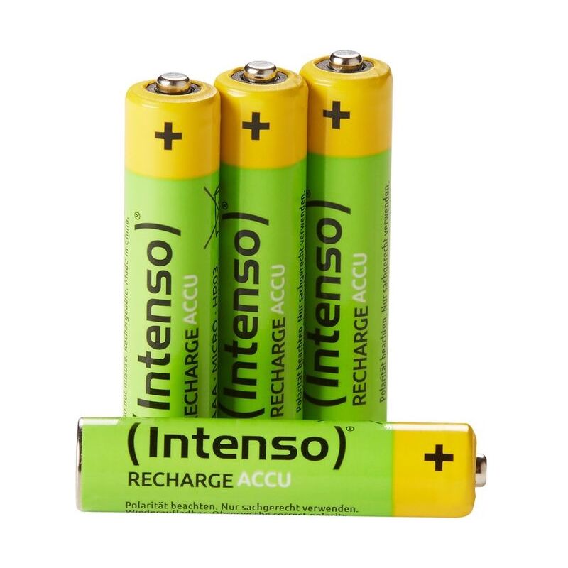 Intenso HR03 NiMH Energy Eco 1000mAh 4er Blister - Micro (AAA) - 1.000 mAh. Tipo batteria: Batteria ricaricabile, Battery size(s): Mini Stilo AAA, Tecnologia batteria: Nichel-Metallo Idruro (NiMH). Altezza: 44,5 mm, Diametro: 1,05 cm, Peso: 12,9 g. Tipo di imballo: Blister