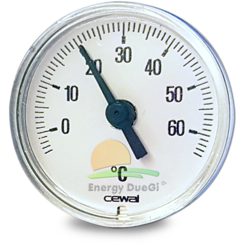 Descrizione Termometri bimetallici, specificamente studiati per controllare la temperatura in impianti di riscaldamento a pavimento. Vengono trattenuti negli appositi alloggiamenti delle rampe di distribuzione da una molla di ritegno a clip. PRINCIPALI SETTORI DI IMPIEGO: Impianti di riscaldamento a pavimento RIFERIMENTI NORMATIVI: - UNI EN 13190 classe di precisione 2 - grado di protezione IP31 secondo EN 60529 LIMITI DI IMPIEGO: Temperatura ammessa sul corpo del termometro -20 ÷ +70 °C Caratteristiche Scala: 0 ÷ 60 °C Cassa: in acciaio inox AISI 304 lucidato Vetrino: in metacrilato ad alta trasparenza Quadrante: in alluminio preverniciato Gambo: in tubo ottone Ø 9 mm Molla: a clip di ritegno in acciaio nichelato