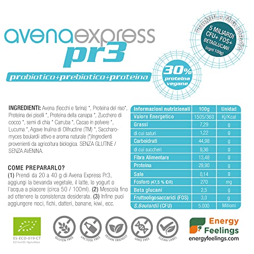 Energy Feelings Avena Express PR3 Bio/Mix Avena con Proteine Biologiche Vegane/Avena Premium, 30% di Proteine Vegetali, Cacao, Lucuma, Carrubba, Inulina Agave, Boulardi... 1Kg