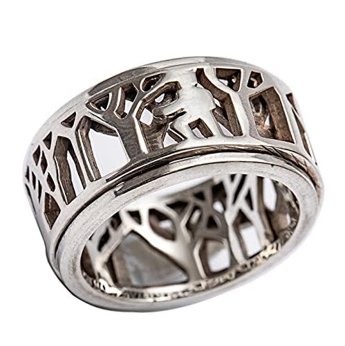 ❁ PENSATO PER DONARE QUIETE. Nell'elemento girevole, una donna è in piedi tra maestosi, splendidi alberi. Alla base dell'anello, sotto di essa, si erge la sagoma di un secondo albero cavo. Che tu scelga di ruotarlo velocemente o lentamente, lo spinner lascerà che tu trovi il tuo ritmo personale e ti coinvolgerà con i pittoreschi effetti che ogni pausa lascerà nel tuo animo.