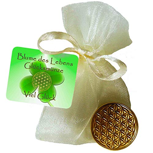 Enermax cromato - Fiore della Vita della moneta come portafortuna, del metallo - colore: oro - fiore della vita di Talisman singolarmente come regalo nel sacchetto di organza, Metallo, Viel Glück, 1 pezzo