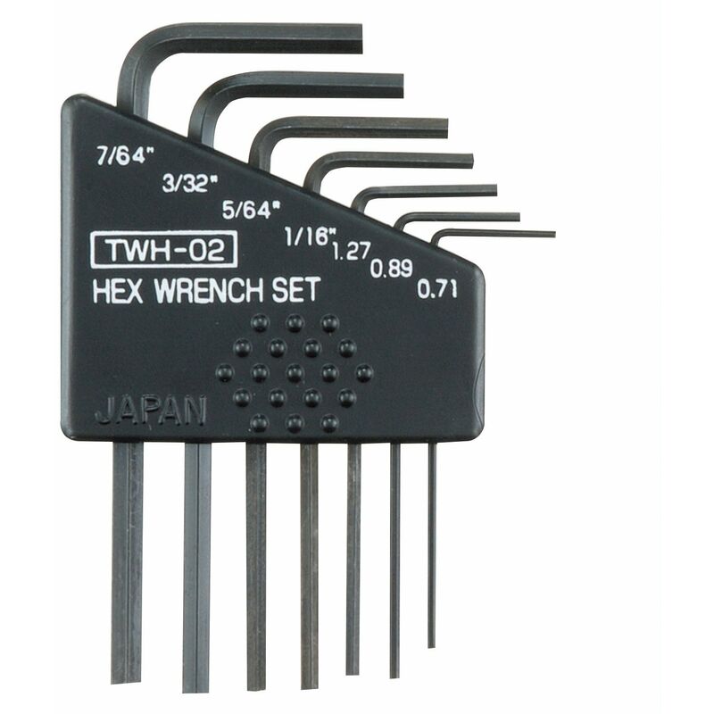 Un set di sette chiavi esagonali imperiali di piccole dimensioni. Prodotto in Giappone da un produttore di utensili manuali di precisione molto apprezzato e di lunga data. Le dimensioni contenute nel set sono 0,71 mm, 0,89 mm (le due chiavi esagonali più piccole in questo set sono metriche), quindi 1,27 mm (0,05), 1/16, (1,59 mm), 5/64 (1,98 mm), 3/32 (2,38 mm) e 7/64 (2,79 mm). Fornito in un pratico supporto in plastica.