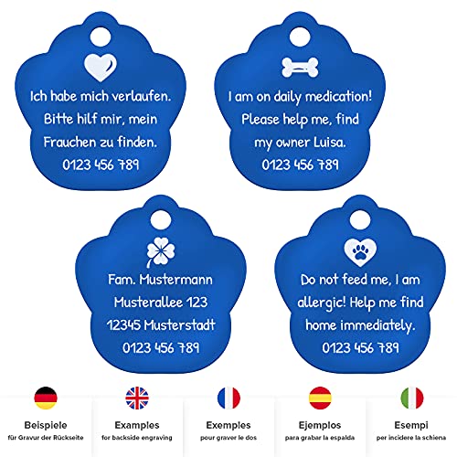 ENGRAVO Medaglietta cane con Incisione per Cani. Targhetta Cane a Forma di Zampa di Colore Blu e 2 portachiavi gratuiti. progetta il tuo ora medaglietta cane personalizzata!