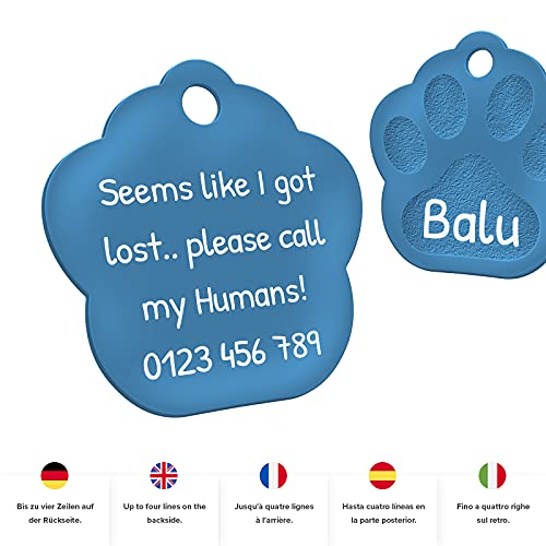 ENGRAVO Medaglietta cane con Incisione per Cani. Targhetta Cane a Forma di Zampa di Colore Azzurro e 2 portachiavi gratuiti. progetta il tuo ora medaglietta cane personalizzata!
