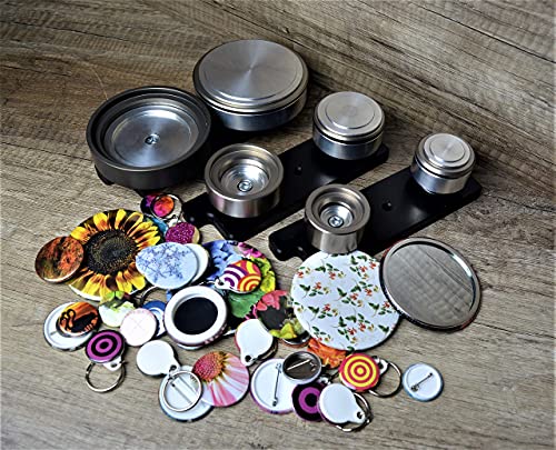 La confezione contiene: macchina crea spille, 3 differenti stampi in dimensioni a scelta, cutter rotondo, piano di taglio, materiale d'assemblaggio per 750 spille e semplici istruzioni