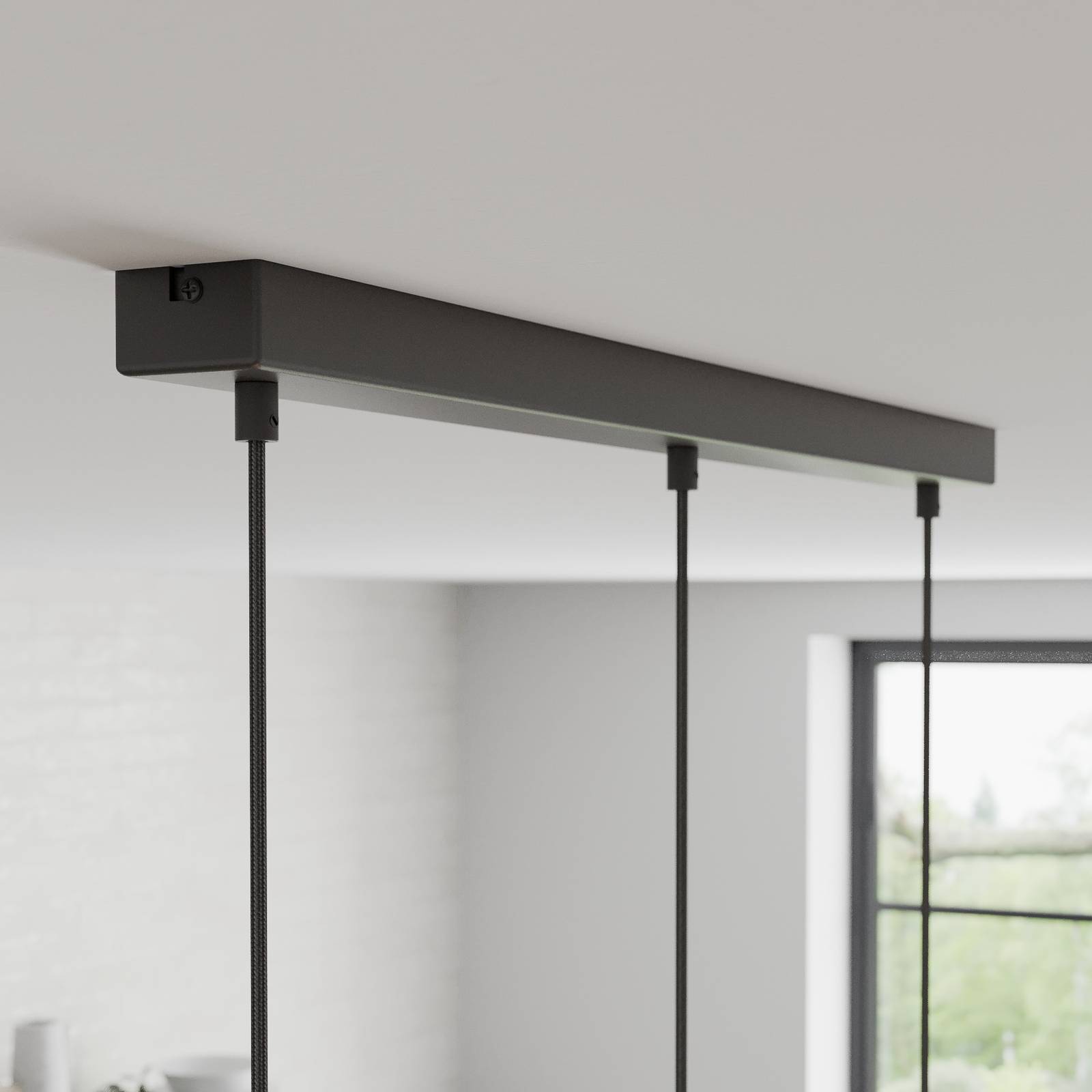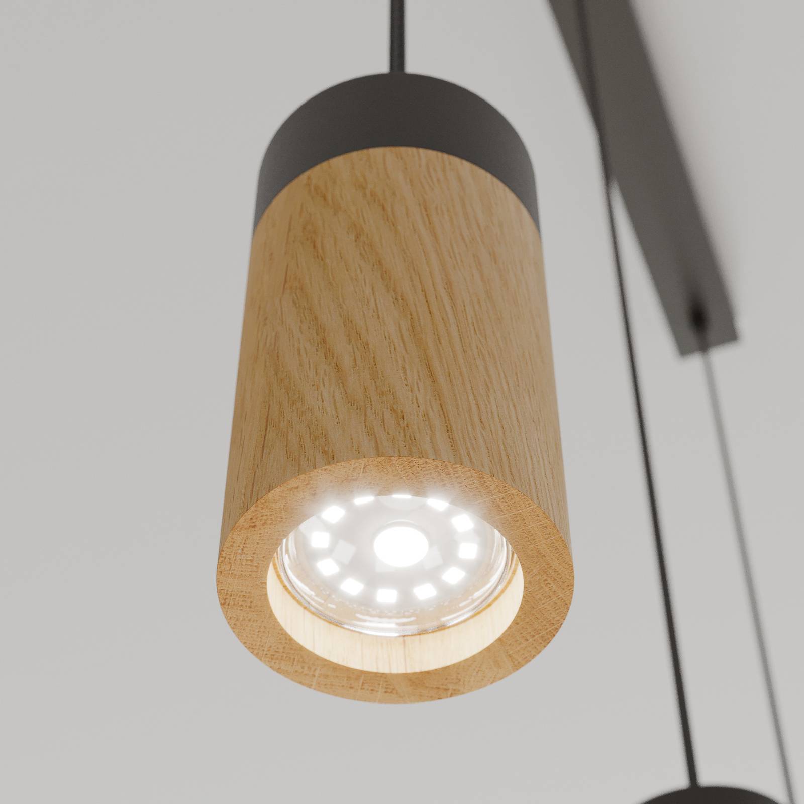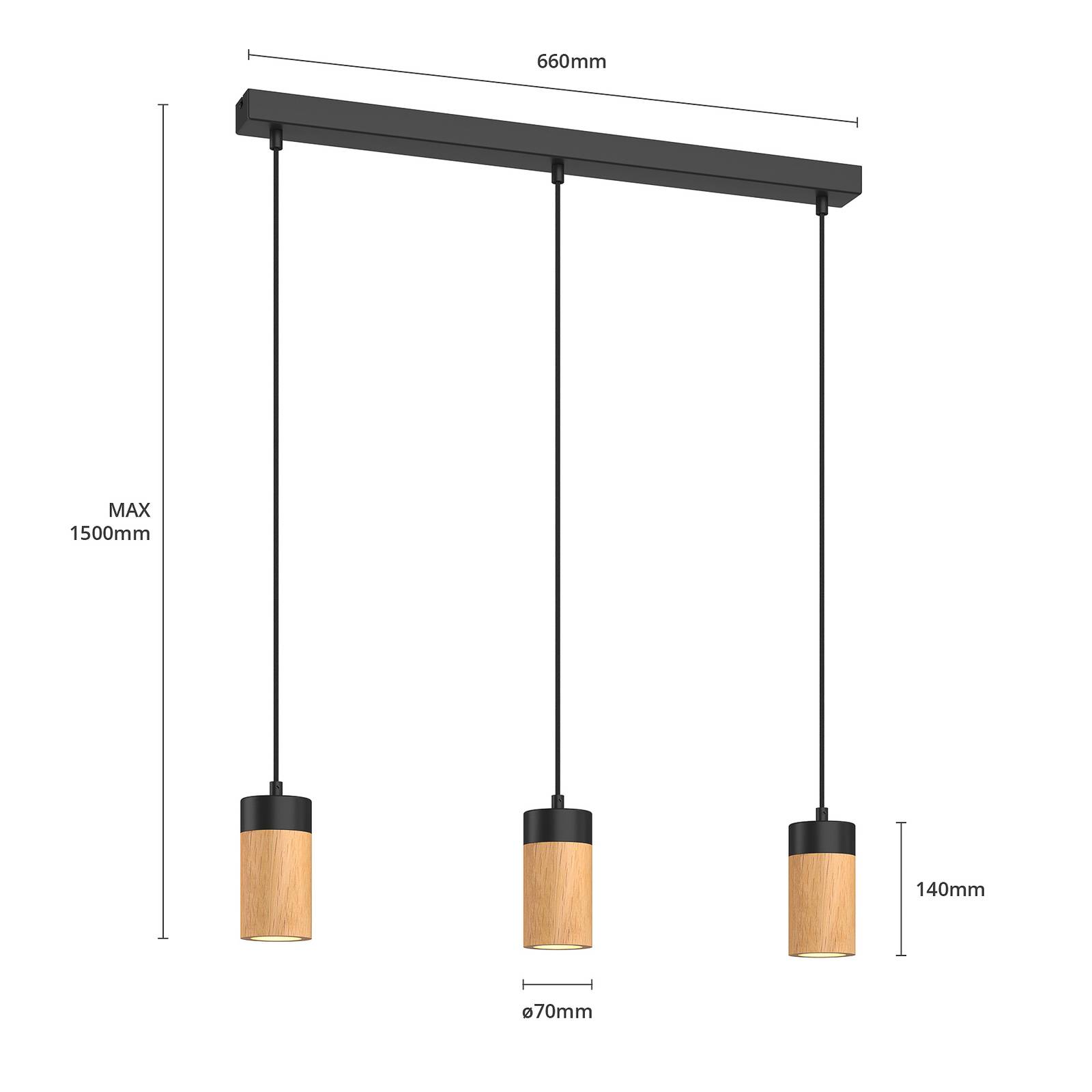 Lampada a sospensione Plain a 3 luci, in metallo e legno di quercia, con rosone allungato La lampada a sospensione Plain è fissata al soffitto con un rosone rettangolare e stretto in metallo. Da questo pendono tre paralumi tramite un cavo in tessuto. Questi hanno un attraente elemento in legno di quercia e sono di forma cilindrica. La combinazione di materiali e colori conferisce un tocco moderno e naturale all'ambiente, mentre la forma dei paralumi fa sì che la luce venga emessa verso il basso in punti specifici. Questo la rende ideale per illuminare tavoli o banconi. La lampada a sospensione può essere utilizzata sia in abitazioni private che in ambienti di ristorazione. Il marchio Envostar attribuisce grande importanza alla sostenibilità dei suoi prodotti. Il legno di quercia utilizzato per Plain proviene da aree ecologiche ed è certificato FSC. Poiché le lampade sono prodotte in Europa, le distanze di trasporto sono brevi e le emissioni di CO2 sono ridotte. Plain viene spedita in un imballaggio realizzato con materiali riciclabili.