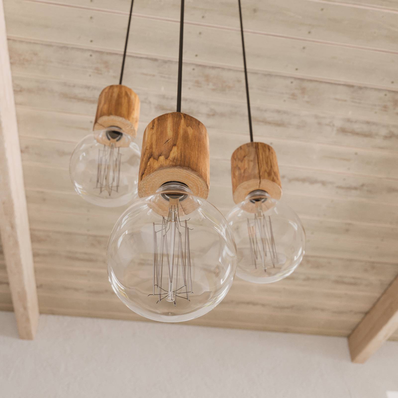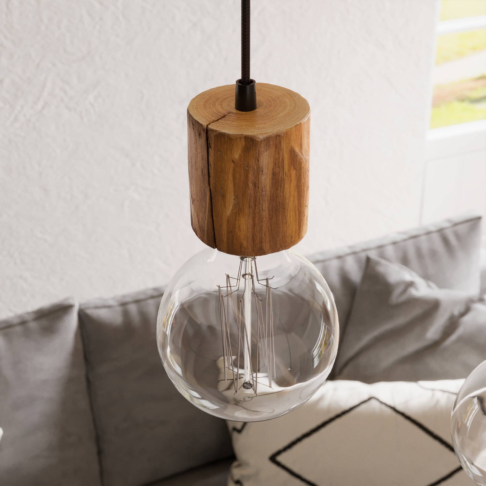 Lampada a sospensione Terra a 3 luci in legno di pino tinto di forma rotonda La lampada a sospensione Terra è costituita da un rosone nero di forma rotonda da cui pendono tre portalampada ciascuno con un cavo tessile. Questi sono realizzati in legno di pino chiaro e sono disposti ad altezze diverse. Grazie al design e alla combinazione di materiali, la lampada non funge solo da fonte di luce ma anche da splendido elemento decorativo ed è adatta all'uso in corridoio o in soggiorno. Poiché la lampada a sospensione viene fornita senza sorgenti luminose, queste ultime possono essere selezionate in base alle preferenze personali. Anche le condizioni di illuminazione possono essere regolate in base alla posizione individuale. La vista delle tre sorgenti luminose è libera, il che rende le lampade decorative particolarmente adatte all'illuminazione della terra. La luce viene emessa in tutte le direzioni e il marchio Envostar attribuisce grande importanza alla sostenibilità nella produzione delle sue lampade. Il legno di pino utilizzato proviene da regioni ecologiche ed è certificato FSC. La produzione in Europa comporta percorsi di trasporto brevi, con un impatto positivo sulle emissioni di CO2. Terra viene spedita in imballaggi realizzati con materiali riciclabili.