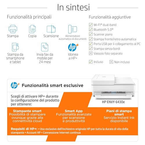 HP Envy 6430e 223R2B, Stampante Multifunzione a Getto d'Inchiostro A4 a Colori, Stampa Fronte e Retro Automatica, 10 ppm, Wi-Fi, HP Smart, 3 Mesi di Inchiostro Instant Ink Inclusi con HP+, Bianca