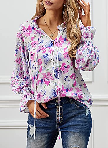 Eogrokerr - Camicetta da donna in chiffon, stile casual, con stampa floreale, scollo a V, maniche lunghe, con coulisse, Aa Rose, XL