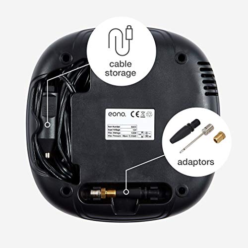Progettata per un utilizzo semplice e intuitivo. La pompa digitale preimpostata Eono rimane saldamente stabile sul terreno e non deve essere sorretta durante il gonfiaggio: Il tubo dell'aria da 50 cm permette di raggiungere la valvola dell'aria a prescindere dalla sua posizione sulla ruota. Il cavo da 3 m ti permette di raggiungere facilmente gli pneumatici tutt'intorno all'auto