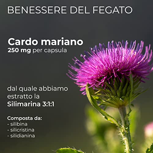 L'UNICO A CONTENERE PER CAPSULA: Cardo mariano 250 mg di cui estratto secco titolato 80% in Silimarina 200 mg e Glutatione 125 mg