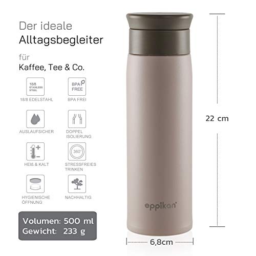 Affidabile tuttofare - La tazza eppikan EppiToGo è realizzata in acciaio inossidabile 18/8 di alta qualità. La tecnologia di isolamento sottovuoto a doppia parete mantiene il caffè & co. caldo più a lungo o fresco più a lungo. Il coperchio in polipropilene alimentare e silicone assicura il 100% di tenuta.