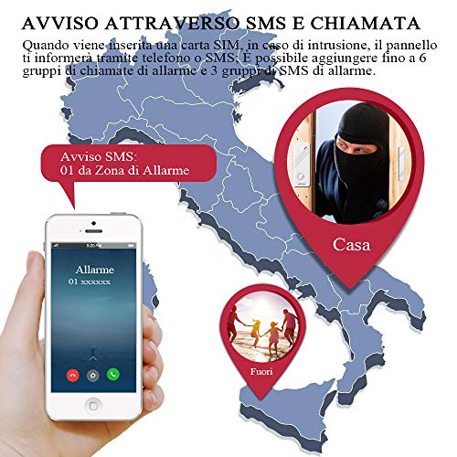 Notifica via SMS e Chiamata: Quando è inserita la scheda SIM (non inclusa), in caso di intrusione, l'unità di controllo vi informa immediatamente tramite chiamata telefonica o SMS;