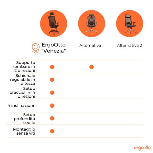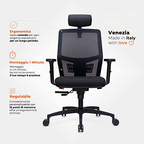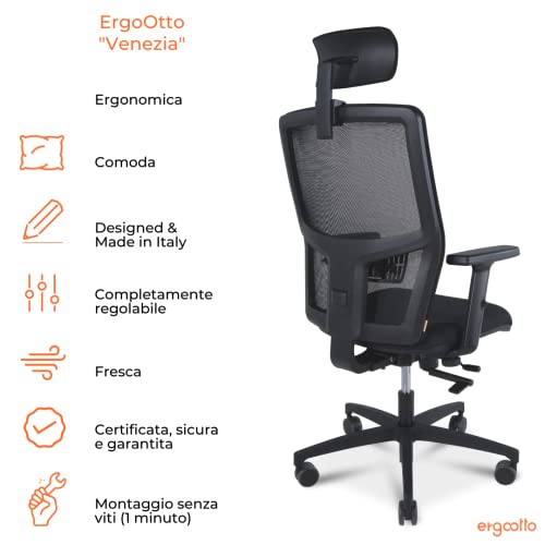 ErgoOtto "Venezia Sedia Ufficio per Persone Alte, Schienale Regolabile in Altezza, Fascia Lombare Ergonomica e Poggiatesta Regolabili, Reclinabile in 4 Posizioni, Montaggio Veloce, Made in Italy