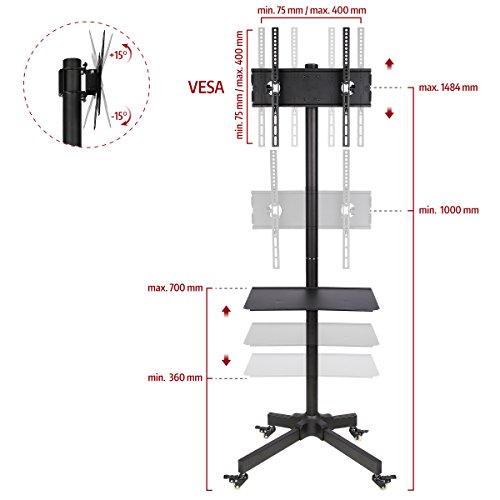 Diversi tipi di regolazione - altezza del supporto regolabile da 100 cm fino a 148 cm, il ripiano può sostenere laptop, lettori, decoder o console di gioco fino a 4 kg, il ripiano può anche essere regolato in altezza da 36cm a 70cm.