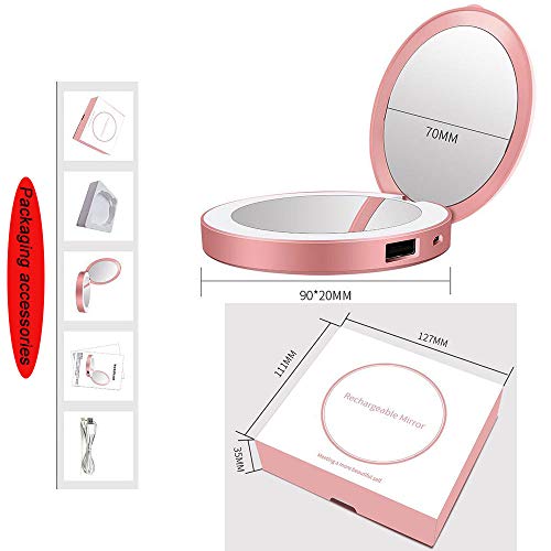 ERHANG Power Bank Mini Specchio Tondo Portatile 1X / 3X Ingrandito Illuminato, Portatile LED Compatto Specchio Da Trucco Da Viaggio Per Ricariche IPhone/IPad/Android,Pink