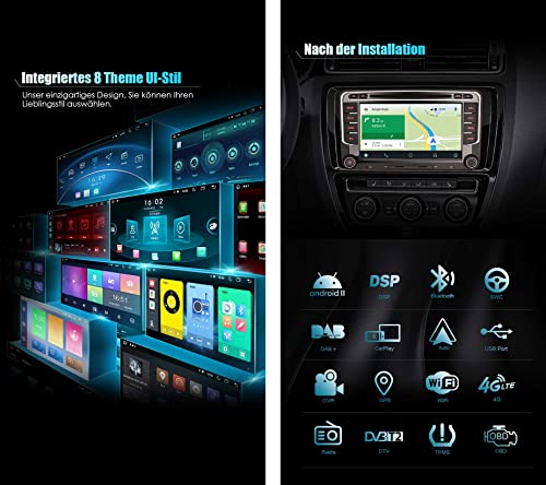 【 CarPlay senza fili + Android Auto cablato/senza fili + DSP 】 È sufficiente collegare l'iPhone tramite Bluetooth e il telefono Android tramite USB/Bluetooth per sincronizzare l'applicazione del telefono con l'autoradio. In questo modo è possibile effettuare facilmente chiamate, inviare e ricevere messaggi, ascoltare musica e utilizzare la navigazione online mentre ci si concentra sulla guida. L'amplificatore DSP incorporato può portare l'esperienza audio definitiva alla vostra auto.
