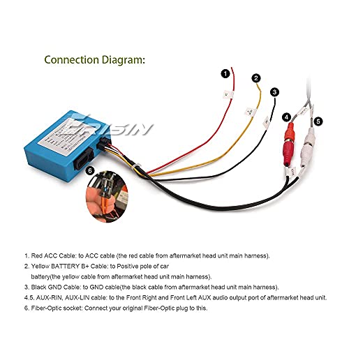 Quando installi questa interfaccia nella tua auto, devi assicurarti che il loop del segnale in fibra ottica non sia interrotto. Se si dispone di altri dispositivi che possono includere un caricatore CD originale, una radio satellitare e un modulo telefonico, devono rimanere collegati in modo che il loop del segnale in fibra ottica sia coerente.