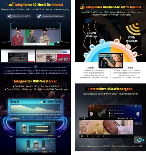 【DualBand-WiFi + 4G-Modulo per Internet】 Questo autoradio Android ha anche un modulo WiFi Dual Band integrato, supporta reti WiFi da 2,4 GHz e 5 GHz, vai online più velocemente. Ha anche un modulo 4G integrato per Internet, supporta il 99% dei gestori nel mondo, supporta la scheda micro SIM. Puoi navigare in Internet, goderti l'intrattenimento online, scaricare app dal Play Store e utilizzare facilmente la navigazione online.