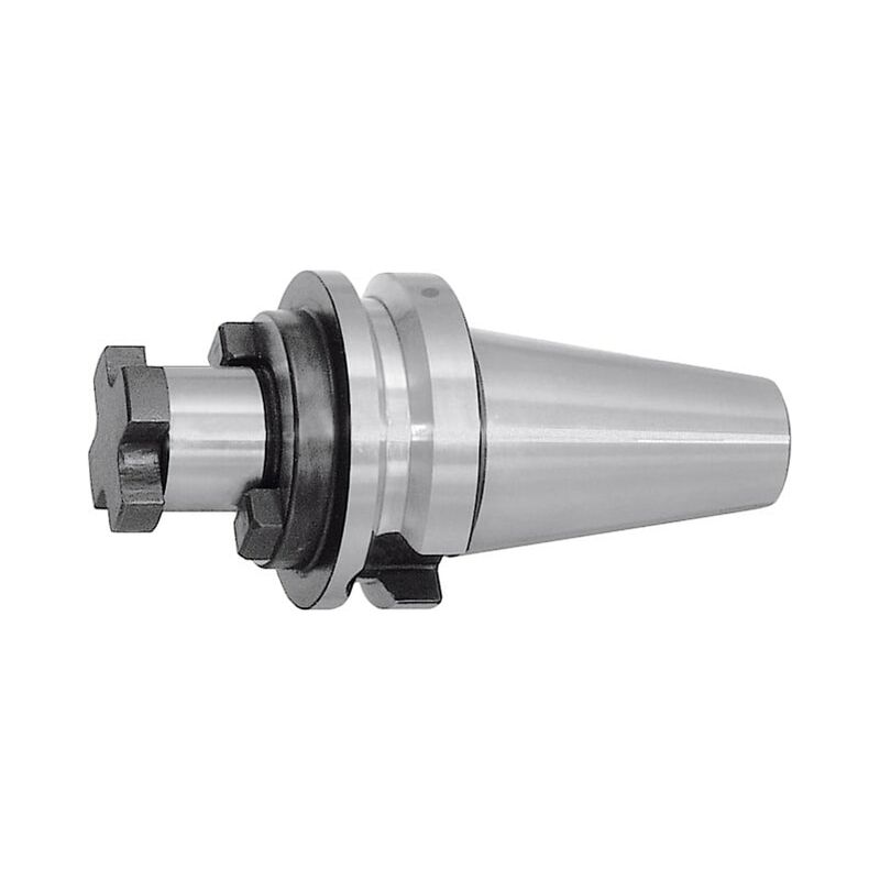 Cono, attacco fresa di supporto e superfici di appoggio rettificati. Tutti i codoli bruniti. Fornitura: Inclusa vite di bloccaggio frese. Accessori speciali: Codoli (AB) n. art. 308760 − 308802. Chiave speciale n. art. 309840. Dati tecnici Qualità equilibratura G con numero di giri G 6,3 con 15000 min-1 Forma ADB Foro per il lubrorefrigerante non richiudibile Norma DIN 6357 Strategia di truciolatura HPC Adattatore BT 40 corto Precisione della concentricità radiale µm ≤ 5 Tipo di prodotto Portafrese con trascinatori frontali Sporgenza totale Dim. A, mm 40 Mandrino di ⌀ d1, mm 22 Vite di serraggio per fresa di ricambio n. art. 309860 / 309861 22 Chiave speciale adatta n. art. 309840 22 ⌀ Esterno D, mm 48
