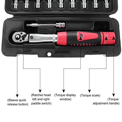 【Facile da usare】 La testa a cricchetto reversibile e la manopola a sgancio rapido consentono di installare o regolare facilmente i componenti meccanici. La chiave dinamometrica può essere preimpostata sulla coppia desiderata e bloccata per evitare la deriva. Sentirai un "clic" quando la chiave raggiunge la coppia preimpostata per evitare una coppia eccessiva (solo in senso orario). maggiore è la coppia, più forte.
