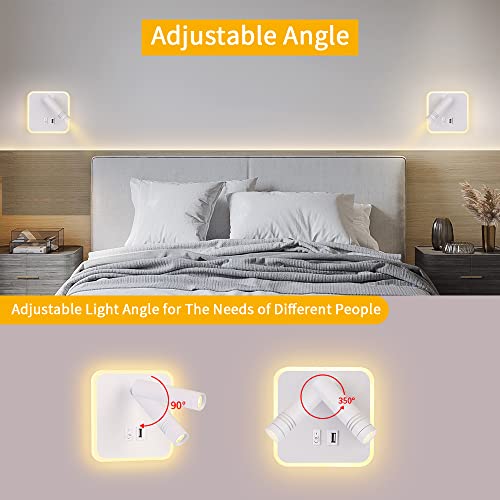 ERWEY Lampada da parete a LED 8W Lampada da lettura da comodino Lampada da letto Faretto orientabile a parete (3W 4000K + 5W 3000K) con porta di ricarica USB (quadrato 138 mm, bianco)