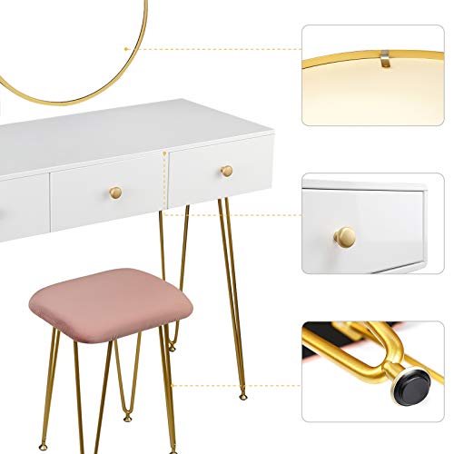 ESituro Tavolo da Trucco con Sgabello in Velluto, Tavolo cosmetico con Specchio Rotondo, Set Toeletta per Make Up con 3 Cassetti per Camera da Letto, 100x40x79 cm, Bianco+ Rosa + Dorato, SDT0045