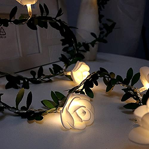 Esoes Ghirlanda di rose a batteria, con luci a forma di fiore bianco e foglie verdi, decorazione per feste, finestre, giardino, ghirlanda (1,5 m, 10 LED)