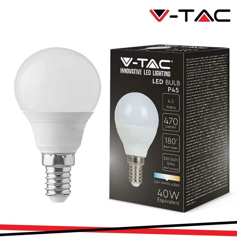 LED Lampadina 4.5W E14 P45 6500K SKU: 2142521: VT: VT-1880 Caratteristiche del prodotto 80% di consumo energetico in meno rispetto alle lampadine standard Lunga durata Nessuna emissione di radiazioni UV e radiazioni non ionizzanti Accensione immediata, nessun tempo di riscaldamento Bassa potenza termica Direttamente sostituibile alle lampade ad incandescenza tradizionali Installazione Aree Commerciali e Residenziali Hotel, Bar Stand espositivi Lampadari Allaperto, esclusivamente allinterno di apparecchi idonei. Specifiche tecniche Informazione generale Attacco E14 Tipo Lampadina P45 Tipo LED SMD Vitamedia 20 000 ore Dati elettrici Potenza 4.5W Potenza EQV. a incandescenza 40W Tensione AC:220-240V Frequenza 50Hz Fattore di potenza >0.5 Dati tecnici luce Fascio Luminoso 180° Efficienza luminosa (lm/W) 104 lm/W Colore della luce Bianco Temperatura di colore 6500K Flusso luminoso (lm) 470 lm Indice di resa cromatica Ra >80 Dettagli corpo Materiale Termoplastico Funzionalità IP Protezione