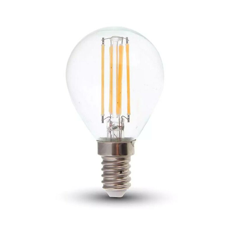 LED Lampadina 6W Filamento E14 P45 trasparente 2700K SKU: 2845: VT: VT-2466 Caratteristiche del prodotto 80% di consumo energetico in meno rispetto alle lampadine standard Lunga durata Nessuna emissione di radiazioni UV e radiazioni non ionizzanti Accensione immediata, nessun tempo di riscaldamento Bassa potenza termica Direttamente sostituibile alle lampade ad incandescenza tradizionali Installazione Aree Commerciali e Residenziali Hotel, Bar Stand espositivi Lampadari Allaperto, esclusivamente allinterno di apparecchi idonei. Specifiche tecniche Informazione generale Attacco E14 Tipo Lampadina P45 Tipo LED Filamento Vitamedia 20 000 ore Dati elettrici Potenza 6W Potenza EQV. a incandescenza 45W Tensione AC:220-240V Frequenza 50Hz Fattore di potenza >0.5 Dati tecnici luce Fascio Luminoso° 300° Colore della luce Bianco caldo Temperatura di colore 2700K Flusso luminoso (lm) 600 lm Indice di resa cromatica Ra >80 Dettagli corpo Materiale Vetro Funzionalità IP Protezione IP20 Tempo
