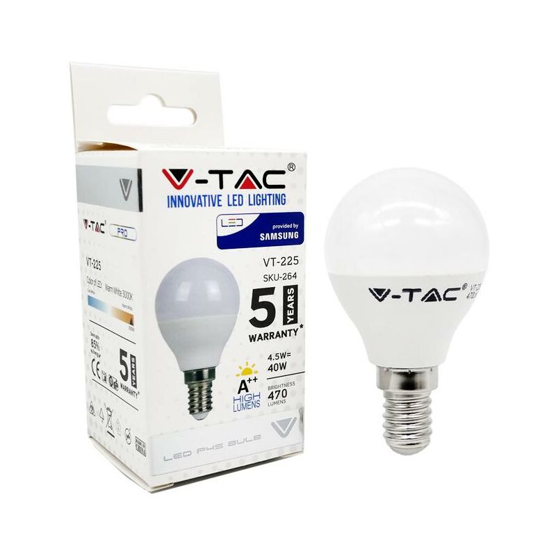 LED Lampadina SAMSUNG Chip 4.5W E14 A++ P45 Plastica 3000K SKU: 264: VT: VT-225 Caratteristiche del prodotto 80% di consumo energetico in meno rispetto alle lampadine standard Lunga durata Nessuna emissione di radiazioni UV e radiazioni non ionizzanti Accensione immediata, nessun tempo di riscaldamento Bassa potenza termica Direttamente sostituibile alle lampade ad incandescenza tradizionali Installazione Aree Commerciali e Residenziali Hotel, Bar Stand espositivi Lampadari Allaperto, esclusivamente allinterno di apparecchi idonei. Specifiche tecniche Informazione generale Attacco E14 Tipo Lampadina P45 Tipo LED SAMSUNG Chip Vitamedia 30000 ore Dati elettrici Potenza 4.5W Potenza EQV. a incandescenza 40W Tensione AC: 220-240V Frequenza 50Hz Fattore di potenza 50Hz Dati tecnici luce Fascio Luminoso° 180° Colore della luce Bianco caldo Temperatura di colore 3000K Flusso luminoso (lm) 470 lm Indice di resa cromatica Ra >80 Dettagli corpo Materiale Termoplastico Funzionalità IP
