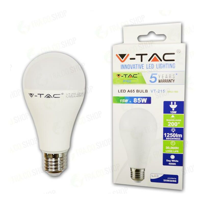 LED Lampadina - SAMSUNG CHIP 15W E27 A65 Plastica Luce Bianco Freddo SKU: 161: VT: VT-215 Caratteristiche del prodotto 80% di consumo energetico in meno rispetto alle lampadine standard Lunga durata Nessuna emissione di radiazioni UV e radiazioni non ionizzanti Accensione immediata, nessun tempo di riscaldamento Bassa potenza termica Direttamente sostituibile alle lampade ad incandescenza tradizionali Installazione Aree Commerciali e Residenziali Hotel, Bar Stand espositivi Lampadari Allaperto, esclusivamente allinterno di apparecchi idonei. Specifiche tecniche Informazione generale Attacco E27 Tipo Lampadina A65 Tipo LED SAMSUNG Chip Vita media 30 000 h Dati elettrici Potenza 15W Potenza EQV. a incandescenza 85W Tensione AC: 220-240V Frequenza 50Hz Fattore di potenza >0.5 Dati tecnici Luce Colore della luce Bianco Temperatura di colore 6400K Flusso luminoso 1250 lm Indice di resa cromatica Ra >80 Fascio Luminoso 200 ° Dettagli corpo Materiale Termoplastico Colore Bianco Funzionalità
