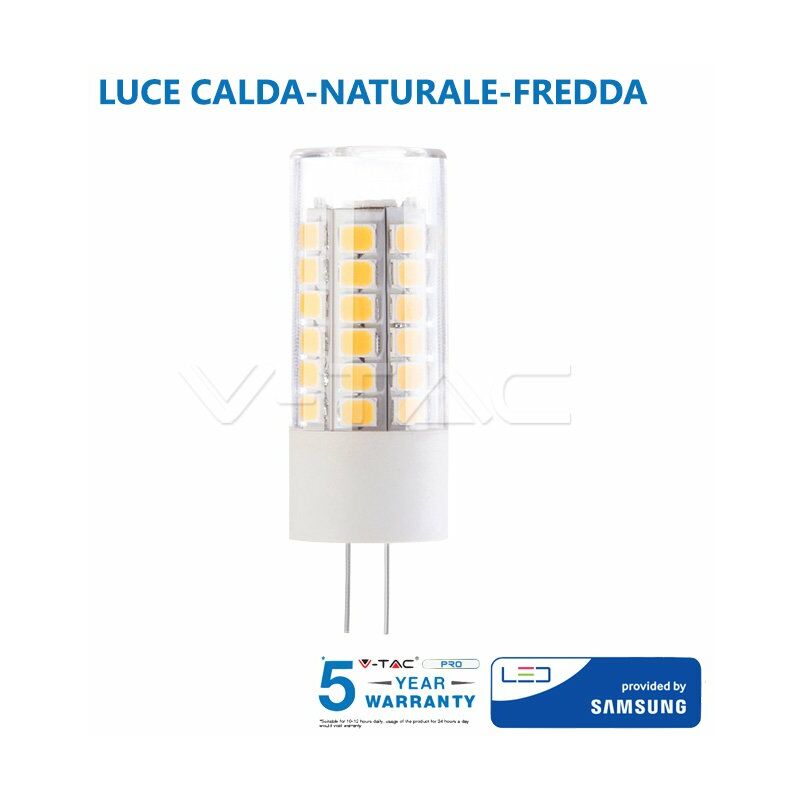 Lampada Led G4 da 3.2W con Chip LED SAMSUNG, corrispondenti a 30W di una lampadina tradizonale. Flusso Luminoso di 385 Lumen e Fascio Luminoso di di 300°. Disponibile con Luce Calda 3000K, Naturale 4000K o Fredda 6400K Produttore: V-Tac Pro Articolo: VT-234 Tipo di Attacco: G4 Alimentazione: 12V, AC/DC Marca Chip Led: Samsung Tipologia Led: SMD Potenza: 3.2W Flusso Luminoso: 385 Lumen Rapporto Lumen/W: 120 Apertura Fascio Luminoso: 300° Potenza Equivalente a Lampada Incandescenza: 30W circa Colore della Luce: Bianco Caldo 3000K, Bianco Naturale 4000K o Bianco Freddo 6400K Indice di Resa Cromatica (CRI): >80 Vita Media: Fino a 30.000h Dimmerabilità: NO Classe di isolamento: IP20 Dimensioni: ø 16mm h. 38mm