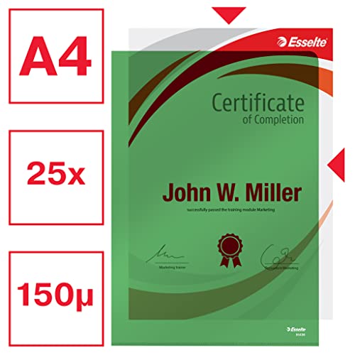 Contenuto: 1x Confezione da 25 buste heavy duty Esselte, formato A4, trasparente, foglio in pvc, dimensioni (l x a x p): 22 x 0.1 x 31 cm, verde, 55436
