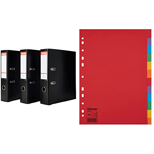Esselte D75 Essentials Set di 3 Raccoglitori a Leva, Colore: Nero Unico A4 Nero & Divisori per Raccoglitori con 12 Tasti, Formato A4, Rosso/Multicolore, Cartoncino Robusto Riciclato, 100202