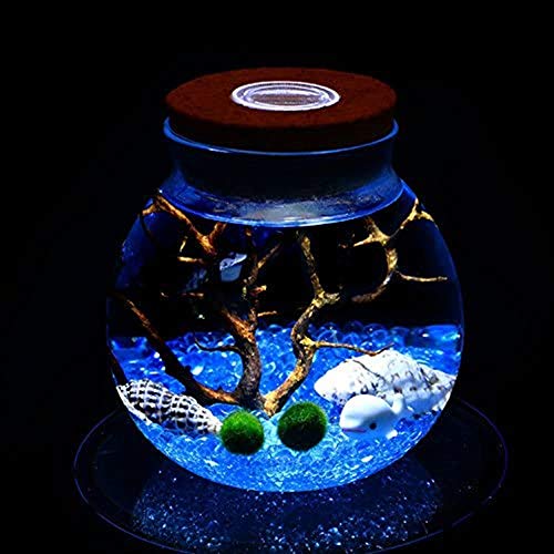 EssenceLiving LED Aquarium Marimo Kit - Globe Vaso di vetro con 2 sfere di muschio acquatico blu ciottoli di vetro ventilatore corallo ramo e conchiglie ufficio scrivania decorazione centrotavola