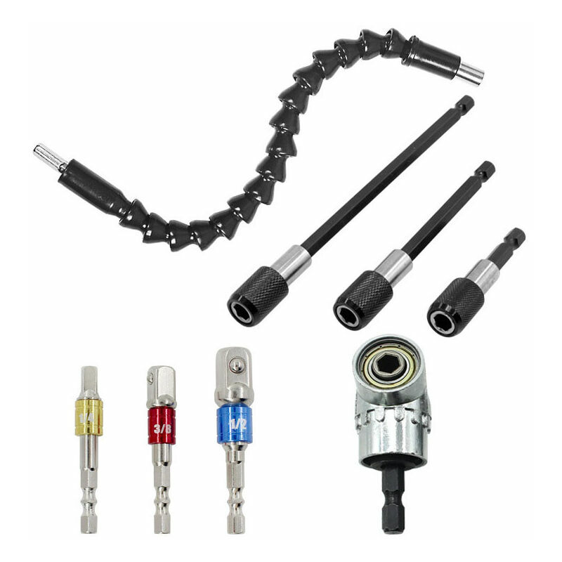 COLLEZIONE COMPLETA - PREZZO IMBATTIBILE - Con trapano ad angolo retto da 105°, 3 adattatori per prese universali 1/4 3/8 1/2'', 3 prolunghe portapunte magnetiche, prolunga per punte da trapano Pieghevole, questo kit copre tutte le basi di prodotti di qualità a un prezzo accessibile per qualsiasi fai da te. Ti consentono di risparmiare e spremere negli spazi in cui il tuo trapano non si adatta. ESTENSIONE FLESSIBILE DEL TRAPANO - L'adattatore per portalampada esagonale da 1/4 n. 34;