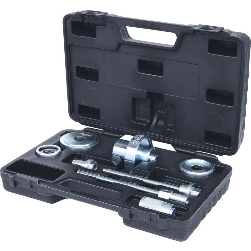 Con questo utensile si possono smontare e rimontare velocemente e correttamente i silentblock sull'asse anteriore. Con l'aiuto della speciale bussola di spinta il silent block viene estratto in sicurezza e in questo modo lo smontaggio può essere effettuato senza danni. L'utensile non richiede smontaggi per essere utilizzato evitando così le conseguenti costose correzione della geometria degli assali e lo smontaggio delle viti spesso consumate dei supporti. Facile applicazione É possibile sostituire le cuffie direttamente sul veicolo Grande risparmio di tempo Adattatore con vite di pressione del cuscinetto reggispinta assiale Si possono evitare le misurazioni dell‘asse In robusta valigetta di plastica Campi di applicazione: Volkswagen Polo (9N), Seat Ibiza IV, Cordoba (dall'anno 2002), Altea, Škoda Fabia, Roomster, Audi A2 + veicoli con la stessa concezione costruttiva Pezzi in set 8 Area di applicazione VAG Peso del tessuto 3200 forza di pressione massima t 1,5 Imballaggio