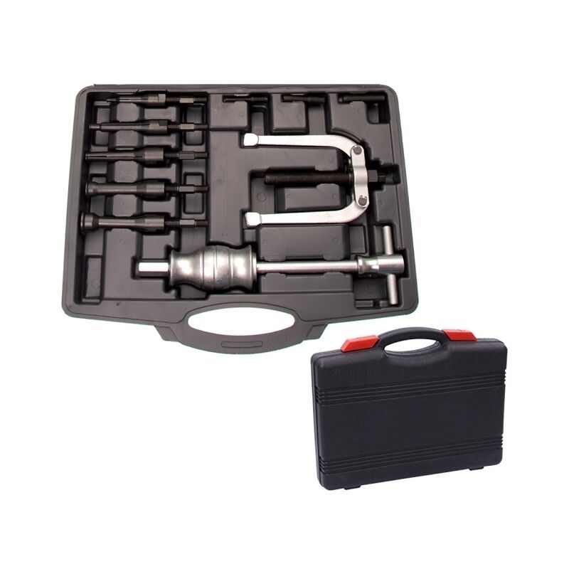 Set composto da dieci pezzi per l'estrazioni di cuscinetti.-- Martello a massa battente meccanico con potenza da 2,5 jaws-- 5 mandrini per foro interno cuscinetti-- 3 Adattatori con filettatura interna -I mandrini di estrazione e gli adattatori possono es