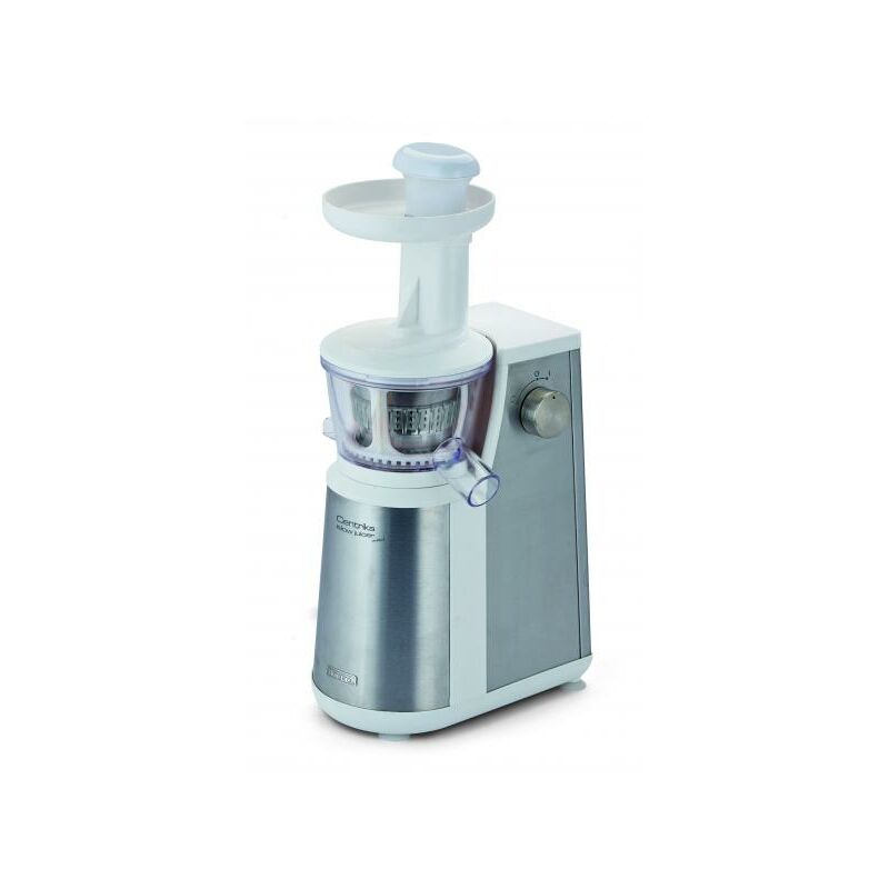 Centrika Slow Juicer Metal è il nuovo estrattore di succo dedicato a tutti gli amanti delle centrifughe e dei succhi di frutta sani e genuini. Grazie all'innovativa tecnologia di estrazione a freddo, si mantengono inalterati i presiosi elementi nutritivi della frutta e della verdura, perchè la spremitura avviene senza lama e con una rotazione lenta (80rpm). Nessuna ossidazione e nessun riscaldamento degli alimenti, per un succo concentrato, ricco di nutrienti, fresco e salutare. Il risultato è una spremuta omogenea e senza residui. Con Centrika Slow Juicer inoltre, si ottiene fino al 30% in più di succo rispetto alle centrifughe tradizionali! Larghezza 150 mm Profondità 240 mm Altezza 330 mm Peso 5,7 kg Potenza 400 W Larghezza imballo 485 mm Profondità imballo 370 mm Peso dell'imballo 7,7 kg Altezza imballo 220 mm Materiale della scocca Plastica, Acciaio inossidabile Tipo di prodotto Estrattore di succo Colore del prodotto Acciaio inossidabile, Bianco Contenitore succo Sì Contenitore