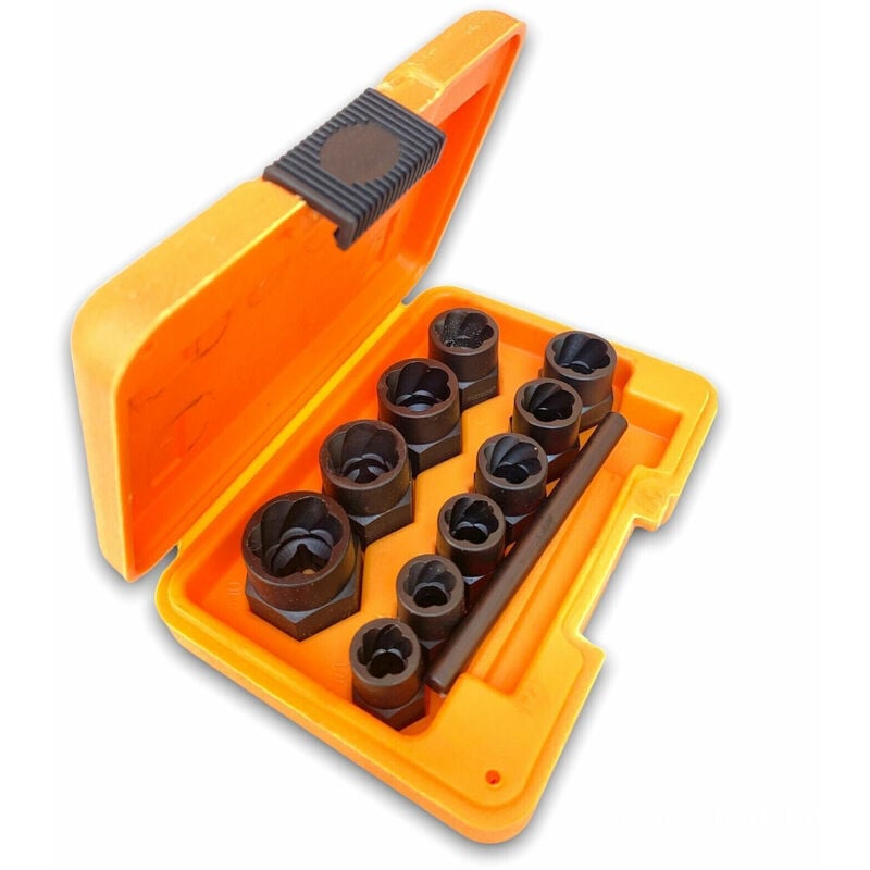 SET 11PZ ESTRATTORI PER DADI E BULLONI DANNEGGIATI RIMOZIONE DI BULLONI 9-19MM Kit di rimozione dei bulloni danneggiati Set da 10 pezzi di bussole per la rimozione dei bulloni danneggiati. Per rimuovere i bulloni arrotondati. Può essere utilizzato con un cricchetto da 3/8 o una barra dell'interruttore. Le prese hanno anche appartamenti da utilizzare con una chiave inglese. Acciaio al cromo molibdeno resistente agli urti. Trattato termicamente, temprato e rinvenuto. Attacco quadro da 3/8. Fornito in una robusta custodia. Set Contiene 10 Dadi: 9 mm, 10 mm, 11 mm, 12 mm, 13 mm, 14 mm, 15 mm, 16 mm, 17 mm e 19 mm