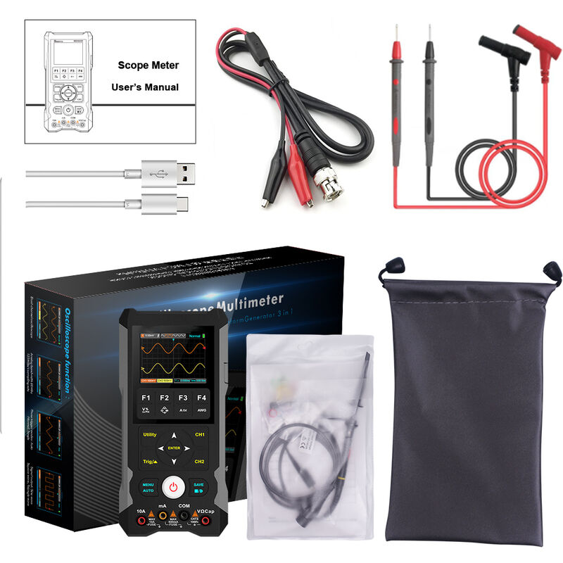 Questo è un tester completo adatto per riparazioni di elettrodomestici, insegnamento universitario, linee di prodotti elettronici, revisioni di controlli industriali e altre occasioni di risoluzione dei problemi in loco. L'innovativa collezione di oscilloscopi, multimetri per oscilloscopi, sorgenti di segnale, è una multifunzione in un oscilloscopio portatile. Dotato di display LCD TFT a colori di grandi dimensioni da 2,8 pollici. Con frequenza di campionamento di 250MSa/s e larghezza di banda di 80MHz. 3 modalità di trigger design di Auto, Normal e Single. Design multifunzionale, con valore relativo, conservazione dei dati, selezione del bagliore residuo, funzione di autocalibrazione, funzione del cursore di memorizzazione dei dati, ricarica rapida da 15 W e così via. Adatto per occasioni elettriche come la manutenzione di automobili e il mantenimento dell'alimentazione. Caratteristiche: Funzione 3 in 1: questo prodotto integra ingegnosamente le funzioni dell'oscilloscopio digitale