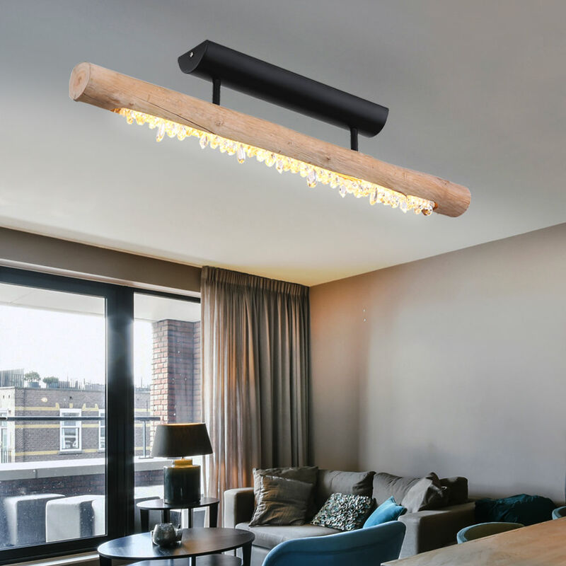 Descrizione Con questa plafoniera, la modernità incontra il collaudato. I cristalli acrilici trasparenti attaccati alla trave di legno attirano l'attenzione nella tua stanza. Grazie alla sorgente luminosa a LED da 15 watt inclusa, questo interno la luce non è solo visivamente un vero colpo d'occhio, perché emette fino a 680 lumen di luce con un colore della luce piacevole e caldo di 3000 Kelvin. Grazie al basso consumo energetico, questo LED è Lampada a risparmio energetico e quindi anche molto rispettosa dell'ambiente. Questa lampada per interni è ideale per il tuo soggiorno e la tua zona pranzo. dettagli apparecchio • Tipo di lampada: plafoniera • Materiale: metallo, legno, cristalli acrilici• Colore: nero opaco, naturale, trasparente • lunghezza x larghezza x altezza in cm: 80 x 8 x 19 • Sorgente luminosa: 1x LED • Sorgente luminosa inclusa: Sì • Potenza sorgente luminosa: 1x 15 Watt • Flusso luminoso: 1x 680 Lumen• Colore luce: bianco caldo • Alimentazione: 230V, 50Hz Dettagli