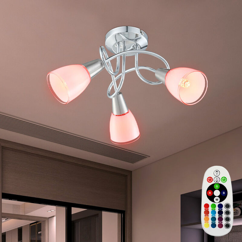 Descrizione Questa bellissima lampada da soffitto promette una luce radiosa. La plafoniera è una parte essenziale dell'illuminazione del soggiorno. Con questa plafoniera, il tuo spazio abitativo come la cucina, il soggiorno o la camera dei bambini sarà perfettamente irradiato. Anche il design della plafoniera vi convincerà. Con il telecomando in dotazione, la sorgente luminosa RGB può essere impostata in 15 colori diversi e fornisce così un'illuminazione d'atmosfera. Rispetto alle normali luci, i faretti LED consumano solo un quantità minima di elettricità e sono in consumo anche sotto lampade a risparmio energetico. Questo protegge l'ambiente e il tuo portafoglio. Sono incluse tre lampade LED RGB di alta qualità a risparmio energetico con telecomando per luce bianca e controllo RGB. Dettagli lampada • Tipo di lampada: plafoniera • Materiale: cromo, nichel opaco • Paralume: vetro bianco con bordo trasparente • Dimensioni diametro x altezza in cm: 36x20 • Prese: 3x E14 • Lampadine