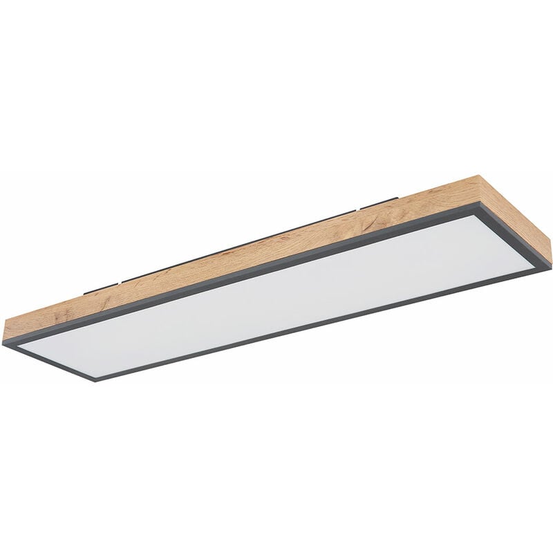 Descrizione Questa lampada da soffitto rettangolare (80x20 cm) è una meravigliosa aggiunta ai tuoi interni con il suo design in legno e alluminio color grafite. Il telaio in alluminio fissato sul legno racchiude l'acrilico opale, che a sua volta copre le lampade a LED incluse. Queste strisce hanno 1500 lumen di luce intensa con un colore chiaro di 3000 Kelvin (bianco caldo). Con la lampada da soffitto Doro puoi dare un tocco di stile ai tuoi interni e completare il quadro generale. Rispetto alle luci normali, i faretti a LED consumano solo una quantità minima di elettricità e hanno un consumo persino inferiore rispetto alle luci a risparmio energetico. Nella fornitura è inclusa una sorgente luminosa a LED di alta qualità a risparmio energetico. Dettagli lampada • Tipo di lampada: plafoniera • Materiale: MDF, acrilico, alluminio • Colore: grafite, effetto legno, bianco opale • Grado di protezione: IP20 • Altezza x lunghezza x larghezza in cm: 6.5x80x20 • Sorgente luminosa: 1x LED