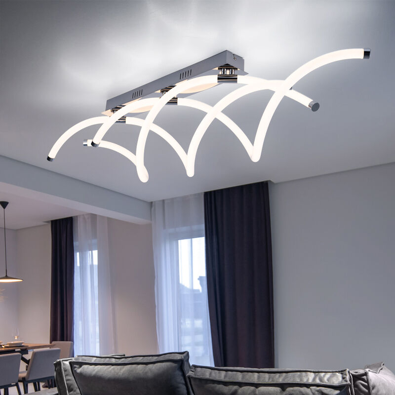 Descrizione Ottieni questo eye-catcher per le tue quattro mura! Una plafoniera con tre tubi curvi, poco appariscente ma comunque elegante e moderna: ecco come si presenta questa lampada in cromo. Può essere commutato su 3 livelli utilizzando un interruttore a parete. In soggiorno, in camera da letto o in corridoio, questa lampada fa ovunque una figura elegante. La sorgente luminosa è già installata in modo permanente nella lampada. Lampada dettagli • Tipo di luce: plafoniera • Materiale: metallo, plastica • Colore: bianco, opale • Dimmer a 3 livelli • Grado di protezione: IP20 • Classe di protezione: 2 • Lunghezza x larghezza x altezza in cm: 107 x 22 x 26 • Sorgente luminosa: 1x LED • Lampadine incluse: sì • Potenza lampada: 30 watt • Flusso luminoso: 2630 lumen • Colore della luce: bianco caldo • Alimentazione: 230 V, da 50 Hz a 60 Hz Dettagli lampadine • Flusso luminoso: 2630 lm (lumen) • Consumo energetico: 30 kWh/1000 ore • Temperatura colore: 3000K (Kelvin) • Colore della luce