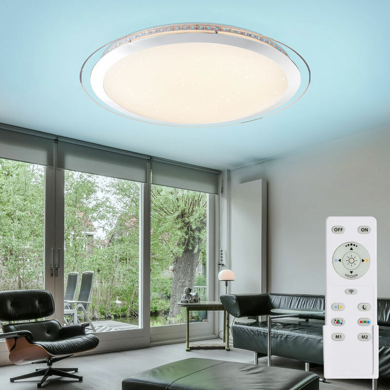 Descrizione Questa straordinaria lampada da soffitto rotonda cromata della serie Nicole colpisce per le sue numerose funzioni. Questo fantastico modello ha un telecomando, che consente molte funzioni come. B. un cambia colore e un fissatore di colore. Il paralume discreto ha un diametro di 55 cm ed è decorato con glitter, che crea un effetto stella trigger. Questa plafoniera dimmerabile fornisce un massimo di 3300 lumen di luce. Una lampadina LED RGB è installata in modo permanente nella lampada. Dettagli lampada • Tipo di luce: plafoniera • Materiale: metallo, cromo • Paralume: acrilico, opale • Circuito CCT (3000-6000K) • Telecomando • Cambia colore• dimmerabile • Diametro x altezza in cm: 55x10 • Sorgente luminosa: 1x circuito LED RGB • Sorgente luminosa inclusa: Si • Potenza sorgente luminosa: 60 Watt • Flusso luminoso: 3300 lumen • Temperatura colore: 3000 - 6000 Kelvin • Colore luce: bianco caldo - bianco freddo • Alimentazione: da 220V a 240V, da 50Hz a 60 Hz Dettagli